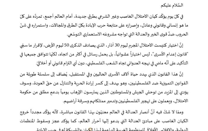 إطلاق “جمعة الدفاع عن الأسرى” ودعوة إلى تصعيد التحركات الشعبية لمواجهة “قانون إعدام الأسرى”