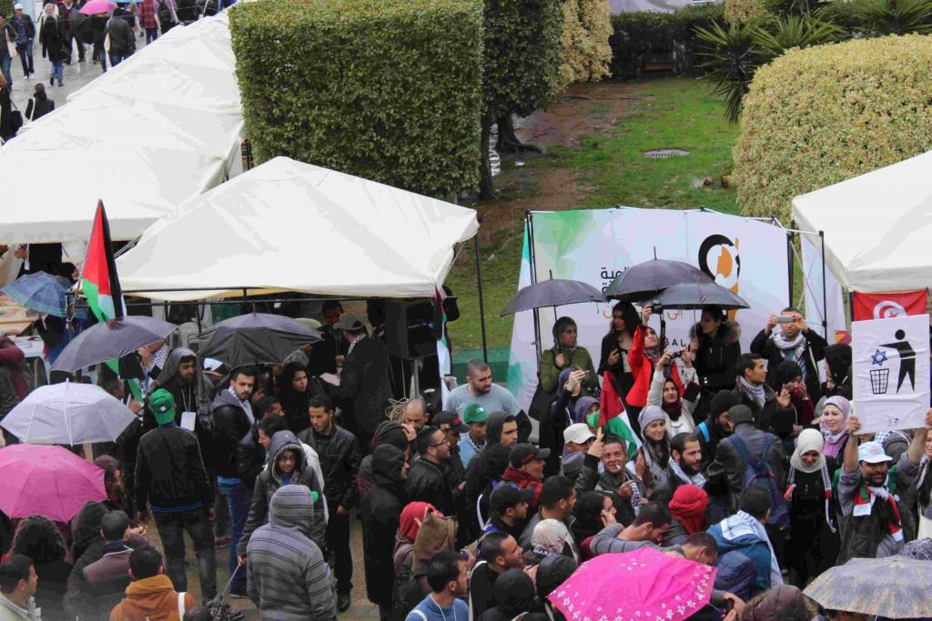الهتافات من الشباب الناشط لفلسطين تعلو من أمام خيمة الحملة العالمية للعودة إلى فلسطين الآن، في المنتدى الإجتماعي العالمي في العاصمة تونس.