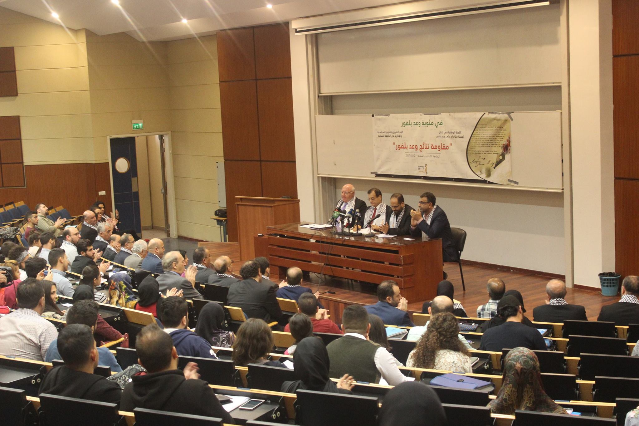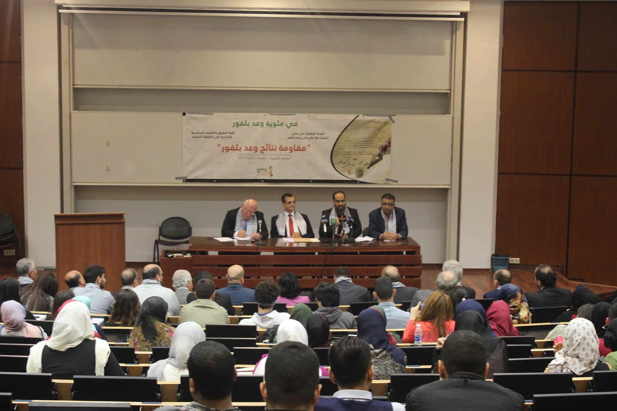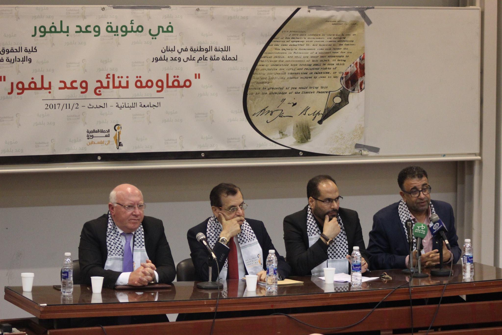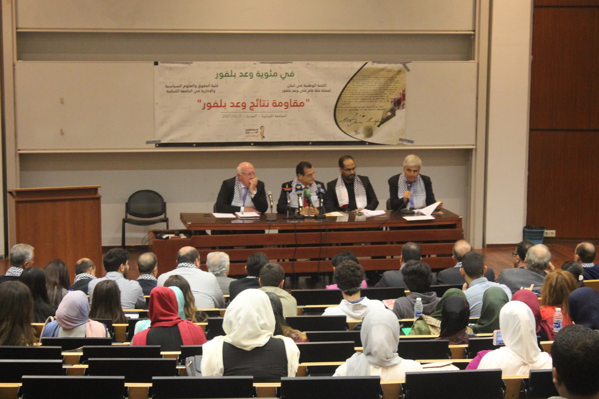 عقدت الحملة العالميّة للعودة إلى فلسطين ندوة بعنوان “مقاومة نتائج وعد بلفور”، وذلك في ذكرى مرور مئة عام على الوعد، في كلية الحقوق والعلوم السياسية والإداريّة في الجامعة اللبنانية، في بيروت، بتاريخ 2-11-2017.