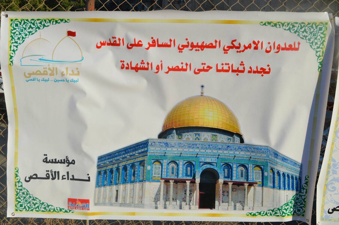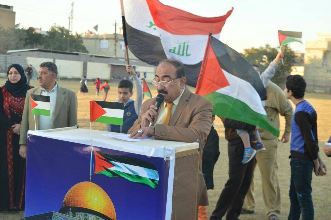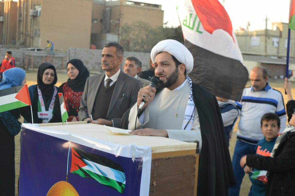 حيث تخلل الوقفة كلمة لرئيس مؤسسة نداء الأقصى الشيخ د.عقيل الكاظمي، الذي تحدث عن دعم القضية الفلسطينية وشعبها ضد الصهيونية والإدارة الأمريكية التي اتخذت قرار الاعتراف بالقدس عاصمة لكيان الاحتلال.