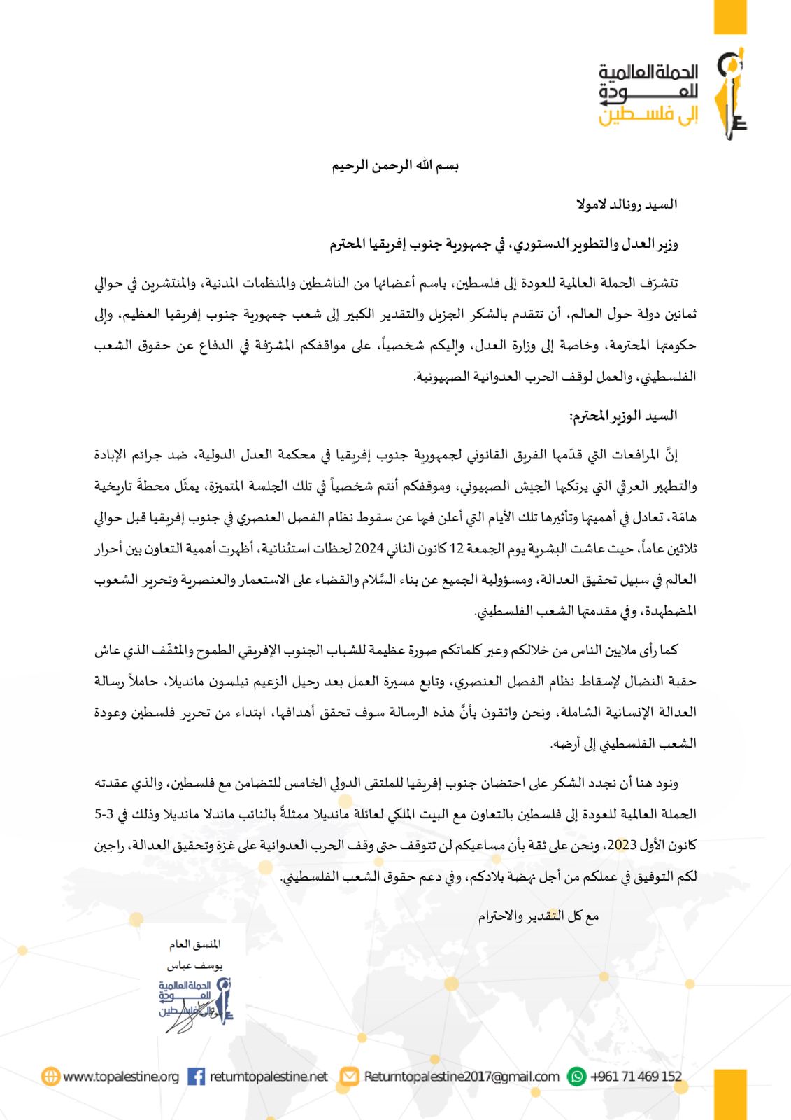 برسالتين لرئيس الجمهورية ووزير العدل.. الحملة العالمية للعودة إلى فلسطين تشكر جنوب إفريقيا على دعمها للقضية الفلسطينية