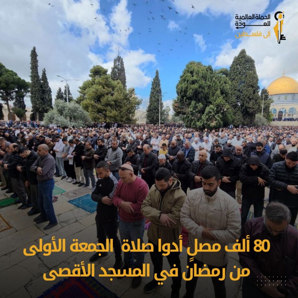 رغم تضييق الكيان الغاصب على الفلسطينيين ومنعهم من الوصول إلى المسجد الأقصى؛ أدى- حسب دائرة الأوقاف في القدس- ثمانون ألفًا من المصلين صلاة الجمعة الأولى من رمضان في المسجد الأقصى المبارك في مدينة القدس.