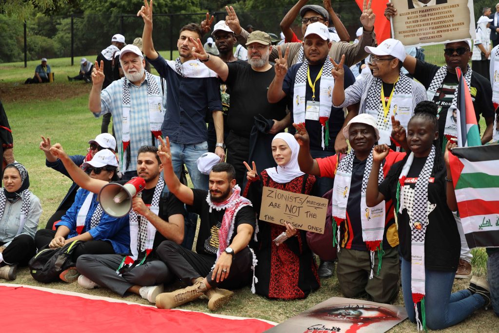 صرخة المشاركين في الملتقى الدولي الخامس للتضامن مع فلسطين خلال زيارتهم للنصب التذكاري للزعيم مانديلا